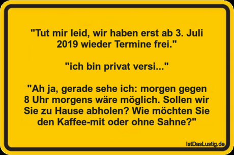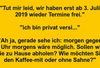 "Tut mir leid, wir haben erst ab 3. Juli 2019 wieder Termine frei."