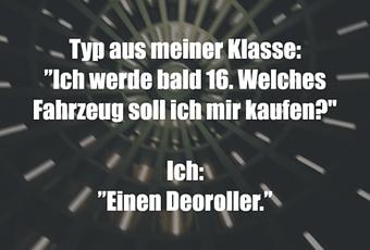 Auf Facebook teilen Vorige Folgende Typ aus meiner Klasse: ”Ich werde bald 16.... Autor des Artikels : istdaslustig Zum Original-Artikel Typ aus meiner Klasse: ”Ich werde bald 16. Welches Fahrzeug soll ich mir kaufen?" Ich: ”Einen Deoroller.” Hier geht es zum Artikel Mehr Lustiges auf www.istdaslustig.de Auf Facebook teilen Vorige Folgende Das könnte Ihnen gefallen Mehr