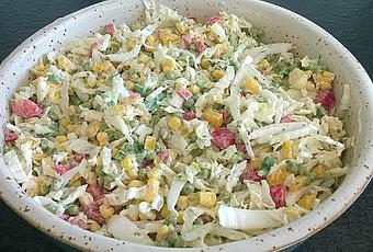 Chinakohl schneiden, Zwiebel u. Paprika würfeln. Abwechselnd mit Mais / Erbsen schichten u. Miracel Whip darauf verteilen. Abgedeckt bis zum nächsten Tag ziehen lassen, dann vermengen! Nach Belieben evtl. Kräuter zufügen und verzieren!