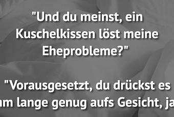 Auf Facebook teilen Vorige Folgende "Und du meinst, ein Kuschelkissen löst meine... Autor des Artikels : istdaslustig Zum Original-Artikel "Und du meinst, ein Kuschelkissen löst meine Eheprobleme?" "Vorausgesetzt, du drückst es ihm lange genug aufs Gesicht, ja." Hier geht es zum Artikel Mehr Lustiges auf www.istdaslustig.de Auf Facebook teilen Vorige Folgende Das könnte Ihnen gefallen Mehr