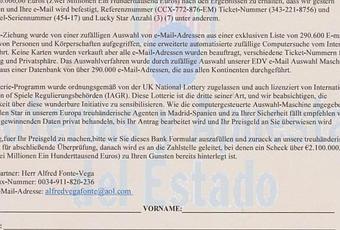 Spam ist ja in der Regel sehr lästig und teilweise gefährlich. Manchmal kommen einem aber Mails unter die sind schon irgendwie wieder lustig. Heute morgen habe ich diese schöne Gewinnbenachrichtigung über 2,1 Mio Euro erhalten ;-) Um meinen Gewinn zu kassieren soll ich mich doch bei Alfred Vega Fonte unter eine AOL! - Adresse per Email melden...Auch die schöne Gewinnbenachrichtigung im 90er Jahre - Word Art Kindergeburtstag-Design ist eigentlich schon ein Kultobjekt! Meine Gewinnzahlen sind da immerhin als bunte Kugeln dargestellt und ich werde als „Herr Gewinn" angesprochen. :-)