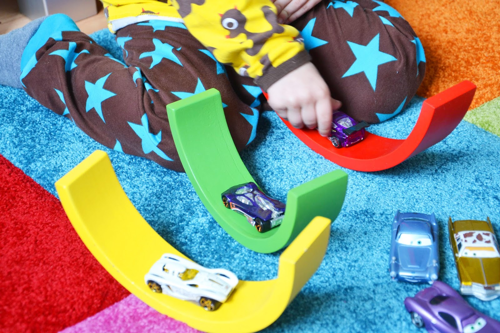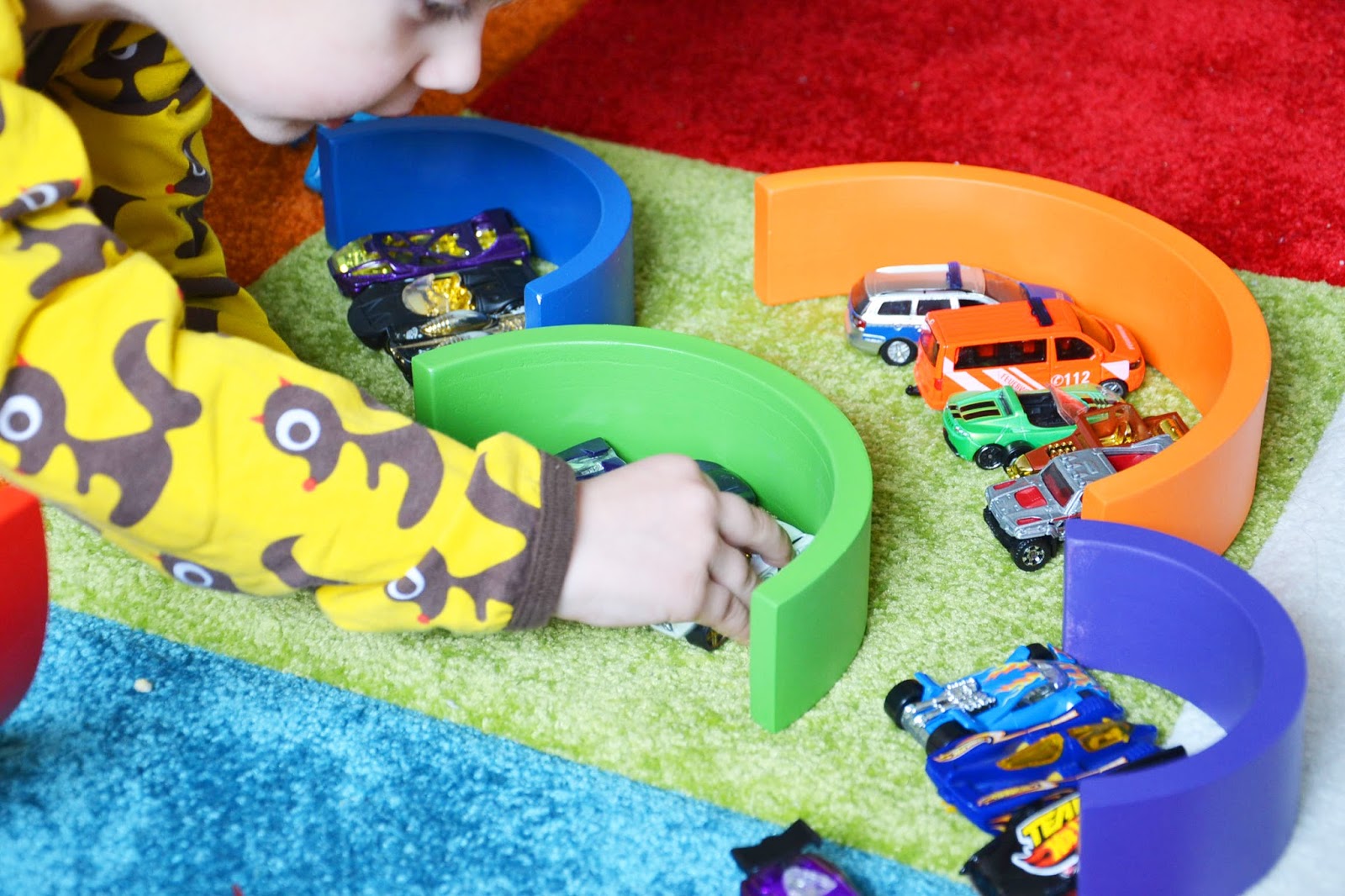 Den ganzen Samstag Morgen hat Leonardo mit seinen Autos gespielt und mit dem tollen Holz Regenbogen Parkplätze, Garagen und Auto Wippen gebaut.