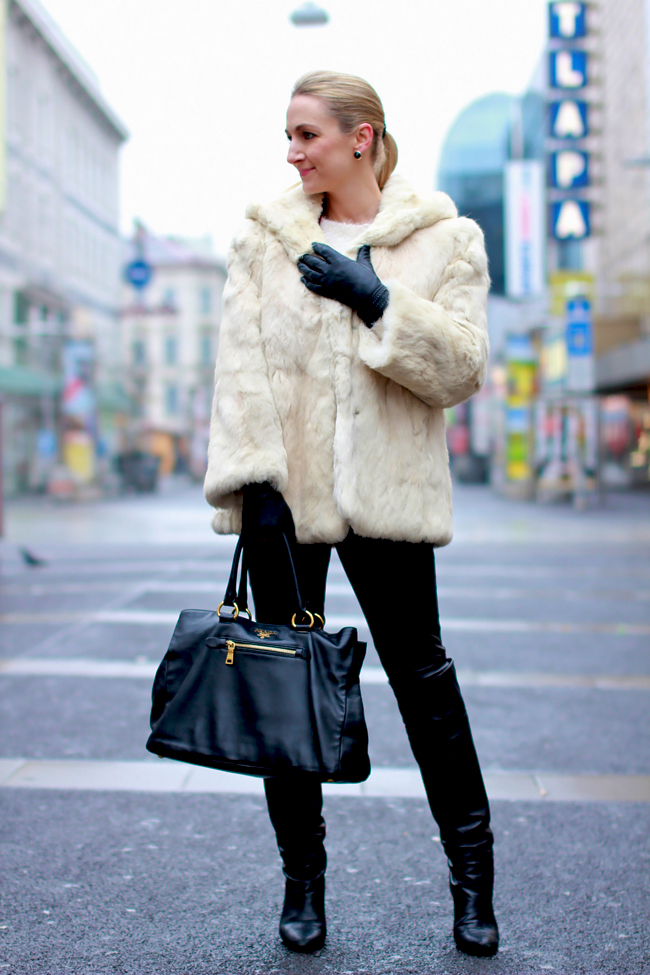 Is it acceptable buying real fur? Even if I'm annoying some of my readers: I wear fur. But not just any fur. If I'm buying or wearing fur, I want to know where does it come from and how it was created. Until now I've only worn fur in the form of trims, caps or vests. A coat or jacekt made of fur wasn't an option for me at any time. But when I've heard from label "Horovitz" of Polish young designer Marta Horowic, I've reflected on fur or rather "upcycled fur" in a detailed way. Cause Horovitz stands for upcycled fur. Designer Marta processes only certified German or Scandinavian vintage fur, bought by herself in second hand boutiques. Marta carefully cleans, re-tailors and redesigns old fur pieces and creates snoods, vests or jackets from it - therefore she produces only single pieces. The aim of Marta is giving a new life to old and no longer used fur and thereby preventing killing again animals by purchasing fur. - That's a sustainable approach and under those conditions I would think about buying a jacket like the one I'm wearing today. - Do you agree? What do you think about fur in common and upcycled fur in detail?fur jacket - Horovitz / leather pants - Zara / pullover - Forever 21 / overknee boots - Buffalo / bag - Prada / gloves - Roeckl / earrings - MaJolie