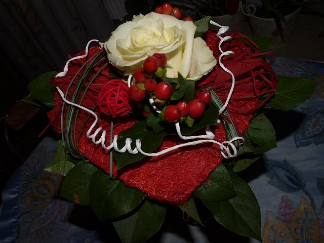 Der Erste Augenmerk geht auf das Rote Herz mit einem Hintergrund aus einem Grünen Blumenmeer und inner eine Creme farbene Rose mit vielen Deko Details aus Weidenkugeln und Kordeln die alles Samt perfekt aufeinander abgestimmt sind und den Blumenstrauß ganz besonders aussehen lassen.