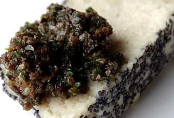 Und damit das Vergnügen vollkommen ist, gibt es zusätzlich eine aromatische Tapenade aus schwarzen Oliven. Diese Paste stammt ursprünglich aus Frankreich und besteht hauptsächlich aus Oliven, dazu kommen noch Knoblauch und Kapern. Tapenade passt quasi zu allem: Frischem Brot, Nudeln, Kartoffeln, zum Aperitif und auch zu diesem Nusskäse.