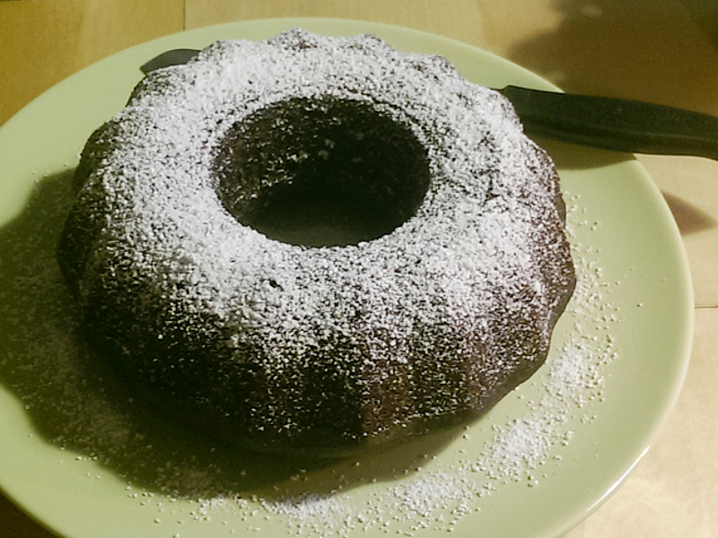 Dann kommen 80 ml Öl, 1 EL Essig und 250 ml Wasser hinzu. Das ganze wird dann zu einer schönen Masse verrührt und kommt in eine gefettete und gemehlte Kuchenform.Den Ofen auf 180 Grad vorheizen und den Kuchen 20 bis 30 Minuten backen lassen. Die Stäbchenprobe verrät ob er fertig ist.
