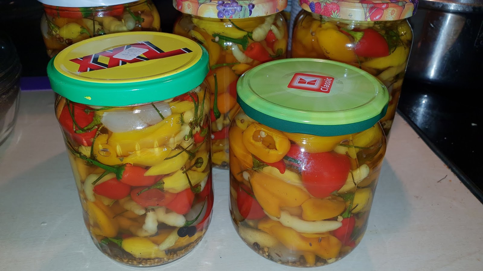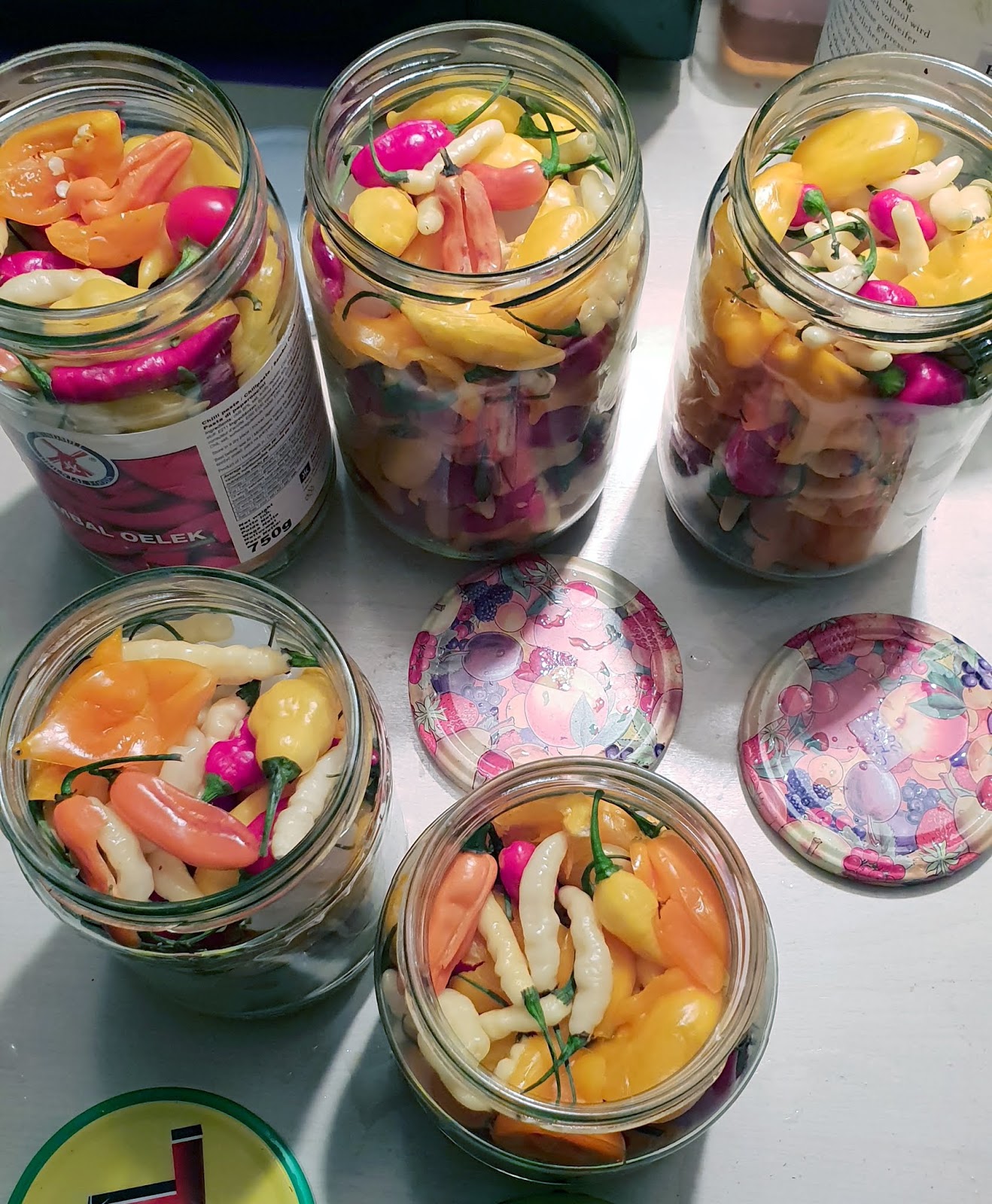 Außerdem einen Großteil sauer eingelegt.Eingelegte Chilis mit Silberzwiebeln: