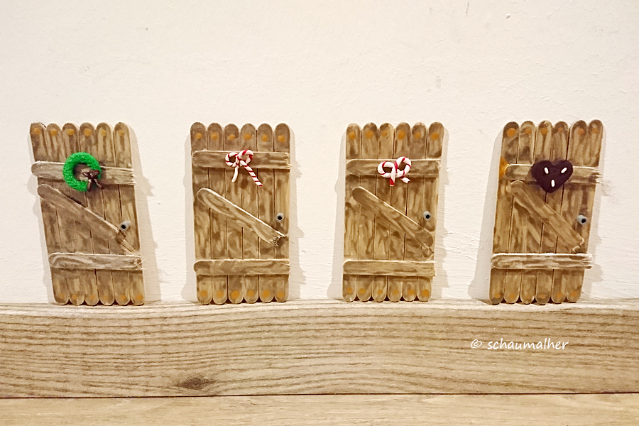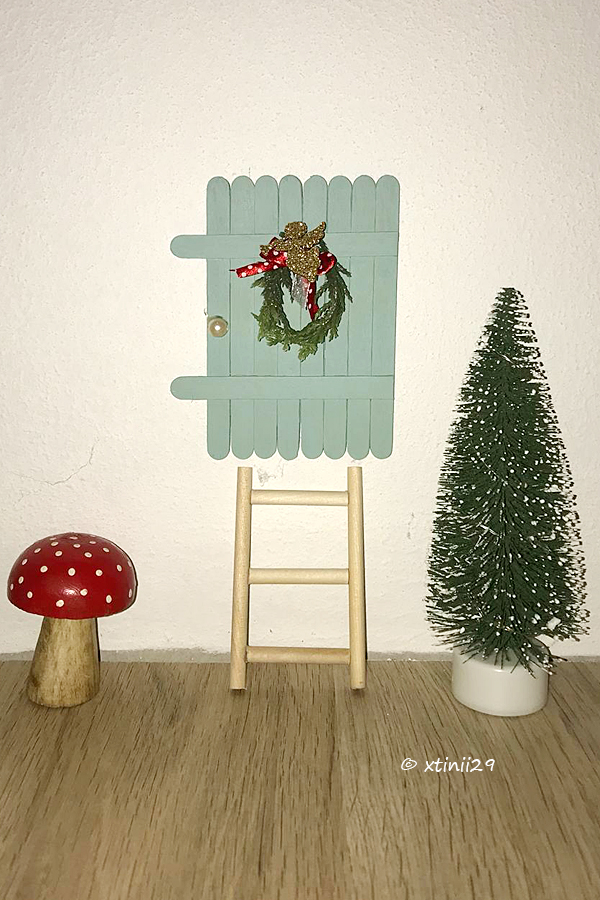 Ich fand diese Geschichte so schön, dass ich uns einen eigenen Elf gewünscht habe und er fand den Weg zu uns. Es fehlt uns noch ein Name, dann können wir ihn nämlich auf der offiziellen Homepage listen lassen und sehen alle Elfen auf der Welt.Als nächstes gibt es die Wichtel, die immer so klein und flink sind, dass man sie nie zusehen bekommt. In den sozialen Netzwerken fand ich die Idee der Wichteltür. Die kann man kaufen oder selber bauen, ich entschied mich für die zweite Variante. Aus Eisstielen, die man sammeln kann über den Sommer oder so wie ich im Bastelladen besorgt, habe ich Wichteltüren gebaut. Die Stiele zusammengeklebt wie Latten, bemalt und mit einem selbstgemachtem Fimo-Türschmuck verschönert.