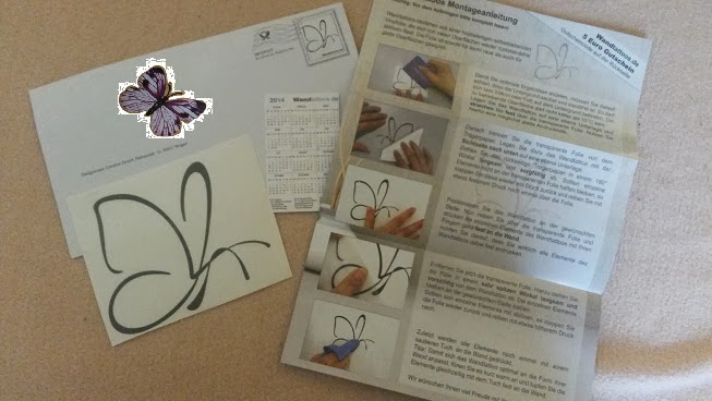 Vor einiger Zeit bevor ich mich entschlossen habe ein Blog zu gründen habe ich bei Facebook bei einer einladung von Gratiswandtattoo teilgenommen und ich bekam keine email, ob ich eins bekomme oder nicht und als ich heute in mein Briefkasten sah, sah ich einen Umschlag, mit einem kleinen Gratis Wandtatttoo, es ist zwar klein und was mich am meisten Freunde es ist ein Schmetterling, die Firma legte mir einen kleinen Taschenkalender für 2014 mit rein und dazu eine Montageanleitung wie man das Wandtattoo am besten an die Wand bringt. Man kann aber auch Problemlos auf http://www.wandtattoos.de bestellen, was ich auch nutzen werde, da sie mir einen Gutschein für 5 Euro mit reingetan haben und auch wirklich wunderschöne Design / Motive gibt.