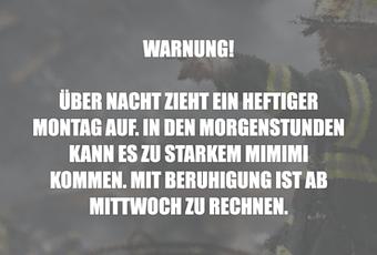 Auf Facebook teilen Vorige Folgende WARNUNG! ÜBER NACHT ZIEHT EIN HEFTIGER MONTAG... Autor des Artikels : istdaslustig Zum Original-Artikel WARNUNG! ÜBER NACHT ZIEHT EIN HEFTIGER MONTAG AUF. IN DEN MORGENSTUNDEN KANN ES ZU STARKEM MIMIMI KOMMEN. MIT BERUHIGUNG IST AB MITTWOCH ZU RECHNEN. Hier geht es zum Artikel Mehr Lustiges auf www.istdaslustig.de Auf Facebook teilen Vorige Folgende Das könnte Ihnen gefallen Mehr
