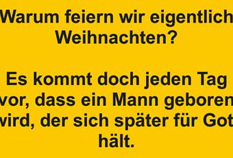 Auf Facebook teilen Vorige Folgende Warum feiern wir eigentlich Weihnachten? Es... Autor des Artikels : istdaslustig Zum Original-Artikel Warum feiern wir eigentlich Weihnachten? Es kommt doch jeden Tag vor, dass ein Mann geboren wird, der sich später für Gott hält. Hier geht es zum Artikel Mehr Lustiges auf www.istdaslustig.de Auf Facebook teilen Vorige Folgende Das könnte Ihnen gefallen Mehr