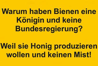 Auf Facebook teilen Vorige Folgende Warum haben Bienen eine Königin und keine... Autor des Artikels : istdaslustig Zum Original-Artikel Warum haben Bienen eine Königin und keine Bundesregierung? Weil sie Honig produzieren wollen und keinen Mist! Hier geht es zum Artikel Mehr Lustiges auf www.istdaslustig.de Auf Facebook teilen Vorige Folgende Das könnte Ihnen gefallen Mehr