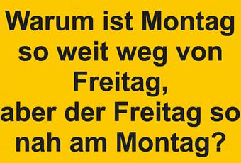 Auf Facebook teilen Vorige Folgende Warum ist Montag so weit weg von Freitag, aber... Autor des Artikels : istdaslustig Zum Original-Artikel Warum ist Montag so weit weg von Freitag, aber der Freitag so nah am Montag? Hier geht es zum Artikel Mehr Lustiges auf www.istdaslustig.de Auf Facebook teilen Vorige Folgende Das könnte Ihnen gefallen Mehr