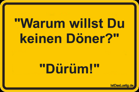 Auf Facebook teilen Vorige Folgende "Warum willst Du keinen Döner?" "Dürüm!" Autor des Artikels : istdaslustig Zum Original-Artikel "Warum willst Du keinen Döner?" "Dürüm!" Hier geht es zum Artikel Mehr Lustiges auf www.istdaslustig.de Auf Facebook teilen Vorige Folgende Das könnte Ihnen gefallen Mehr