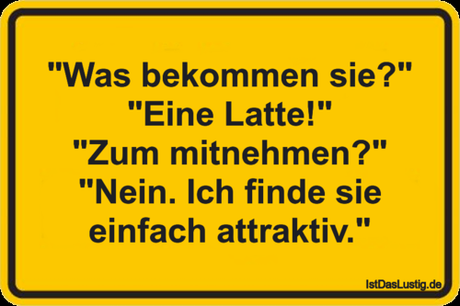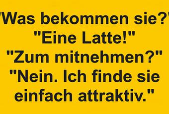 Auf Facebook teilen Vorige Folgende "Was bekommen sie?" "Eine Latte!" "Zum... Autor des Artikels : istdaslustig Zum Original-Artikel "Was bekommen sie?" "Eine Latte!" "Zum mitnehmen?" "Nein. Ich finde sie einfach attraktiv." Hier geht es zum Artikel Mehr Lustiges auf www.istdaslustig.de Auf Facebook teilen Vorige Folgende Das könnte Ihnen gefallen Mehr