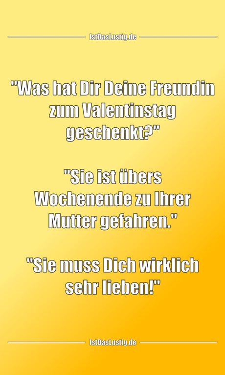 Auf Facebook teilen Vorige Folgende "Was hat Dir Deine Freundin zum Valentinstag... Autor des Artikels : istdaslustig Zum Original-Artikel "Was hat Dir Deine Freundin zum Valentinstag geschenkt?" "Sie ist übers Wochenende zu Ihrer Mutter gefahren." "Sie muss Dich wirklich sehr lieben!" Hier geht es zum Artikel Mehr Lustiges auf www.istdaslustig.de Auf Facebook teilen Vorige Folgende Das könnte Ihnen gefallen Mehr