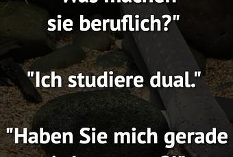 Auf Facebook teilen Vorige Folgende "Was machen sie beruflich?" "Ich studiere... Autor des Artikels : istdaslustig Zum Original-Artikel "Was machen sie beruflich?" "Ich studiere dual." "Haben Sie mich gerade Aal genannt?!" Hier geht es zum Artikel Mehr Lustiges auf www.istdaslustig.de Auf Facebook teilen Vorige Folgende Das könnte Ihnen gefallen Mehr