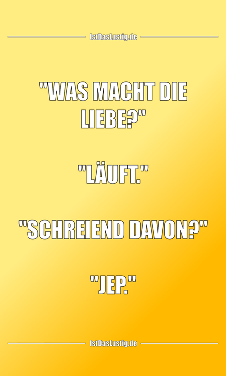 Auf Facebook teilen Vorige Folgende "WAS MACHT DIE LIEBE?" "LÄUFT." "SCHREIEND... Autor des Artikels : istdaslustig Zum Original-Artikel "WAS MACHT DIE LIEBE?" "LÄUFT." "SCHREIEND DAVON?" "JEP." Hier geht es zum Artikel Mehr Lustiges auf www.istdaslustig.de Auf Facebook teilen Vorige Folgende Das könnte Ihnen gefallen Mehr