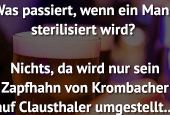 Auf Facebook teilen Vorige Folgende Was passiert, wenn ein Mann sterilisiert wird?... Autor des Artikels : istdaslustig Zum Original-Artikel Was passiert, wenn ein Mann sterilisiert wird? Nichts, da wird nur sein Zapfhahn von Krombacher auf Clausthaler umgestellt... Hier geht es zum Artikel Mehr Lustiges auf www.istdaslustig.de Auf Facebook teilen Vorige Folgende Das könnte Ihnen gefallen Mehr