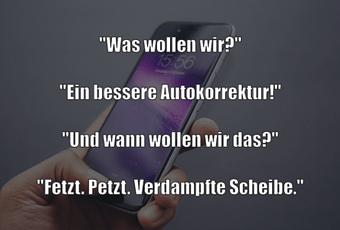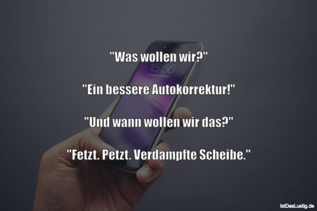 Auf Facebook teilen Vorige Folgende "Was wollen wir?" "Ein bessere... Autor des Artikels : istdaslustig Zum Original-Artikel "Was wollen wir?" "Ein bessere Autokorrektur!" "Und wann wollen wir das?" "Fetzt. Petzt. Verdampfte Scheibe." Hier geht es zum Artikel Mehr Lustiges auf www.istdaslustig.de Auf Facebook teilen Vorige Folgende Das könnte Ihnen gefallen Mehr