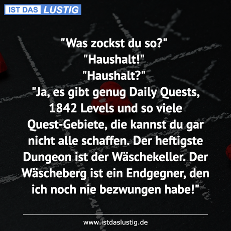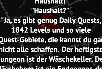 "Ja, es gibt genug Daily Quests, 1842 Levels und so viele Quest-Gebiete, die kannst du gar nicht alle schaffen. Der heftigste Dungeon ist der Wäschekeller. Der Wäscheberg ist ein Endgegner, den ich noch nie bezwungen habe!"