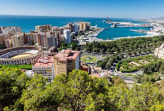 Andalusien ist eine große autonome Region in Spanien, die sowohl Küsten am Atlantik als auch am Mittelmeer hat und sich von Huelva im Westen über Cadiz, Gibraltar, Marbella, Malaga und Nerja bis nach Almeria im Osten erstreckt. Der Badetourismus und Wassersport spielt hier eine wichtige Rollte. Surfer nutzen lieber die Wellen des Atlantiks an der Costa de la Luz (bei Cadiz) während Badeurlauber die höheren Wassertemperaturen des Mittelmeeres an der Costa del Sol (südwestlich von Malaga) zu schätzen wissen. Das Foto zeigt die Stierkampfarena von Malaga, im Hintergrund den Hafen und das Mittelmeer bei wolkenlosem Himmel. Durchschnittliche monatliche Wassertemperaturen in Andalusien im Jahresverlauf