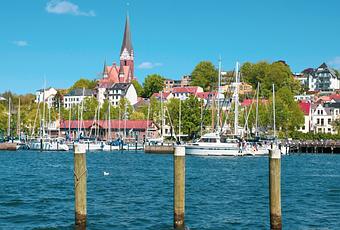 Durch das gefürchtete Punktesystem vor allem bei Verkehrsrowdys bekannt, hat die Deutsche Ostseestadt Flensburg etwa 4 Kilometer südlich der Grenze zu Dänemark mit der wohl schönsten Förde (durch Gletscher entstandene schmale Bucht) des Landes weit mehr zu bieten. Das Bild zeigt den Fischereihafen mit dem dahinter liegenden Stadtviertel St. Jürgen. Weitere Sehenswürdigkeiten sind der Museumshafen, die Seefahrtschule, der Oluf-Samsons-Gang, die Rote Straße, der Museumsberg oder das Nordertor. Durchschnittliche monatliche Wassertemperaturen bei Flensburg im Jahresverlauf