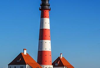 Der Leuchtturm Westerheversand an der Nordsee ist Wahrzeichen der Halbinsel Eiderstedt und eine beliebte Sehenswürdigkeit bei Touristen. Durchschnittliche monatliche Wassertemperaturen an der Nordsee im Jahresverlauf