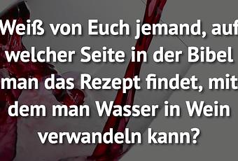 Auf Facebook teilen Vorige Folgende Weiß von Euch jemand, auf welcher Seite in der... Autor des Artikels : istdaslustig Zum Original-Artikel Weiß von Euch jemand, auf welcher Seite in der Bibel man das Rezept findet, mit dem man Wasser in Wein verwandeln kann? Hier geht es zum Artikel Mehr Lustiges auf www.istdaslustig.de Auf Facebook teilen Vorige Folgende Das könnte Ihnen gefallen Mehr