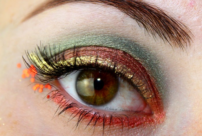 Um die Crease zu betonen und Dimension zu schaffen, habe ich ein dunkles grün eingesetzt, das in Richtung Augeninnenwinkel immer heller wird. Auf dem beweglichen Lid habe ich einen roten, metallischen Lidschatten aufgetupft um ihn so intensiv wie nur möglich zu behalten. Den gleichen Lidschatten habe ich auch an der unteren Wasserlinie benutzt. Im Anschluss habe ich einen goldenen Liner gezogen um das ganze etwas aufregender und farbenfroher zu gestalten. Zum Schluss habe ich noch falsche Wimpern angebracht, rote Glitzerpailetten unter dem äußeren Augenaußenwinkel aufgebracht und mit einem matten hautfarbenen Lidschatten alle harten Kanten verblendet.