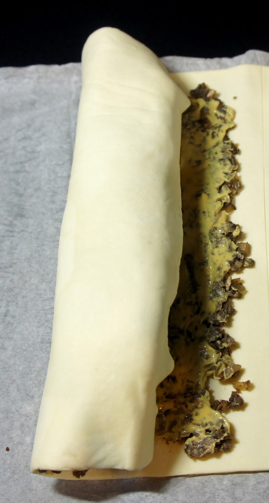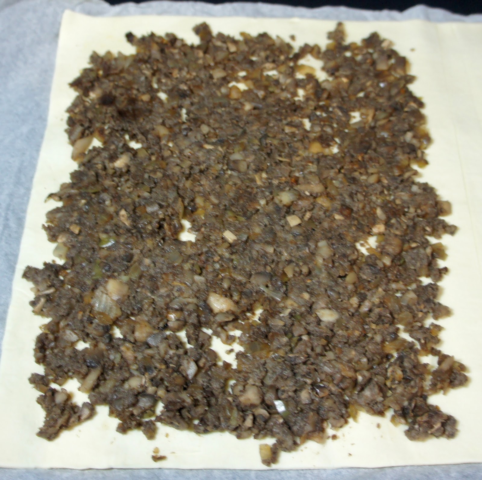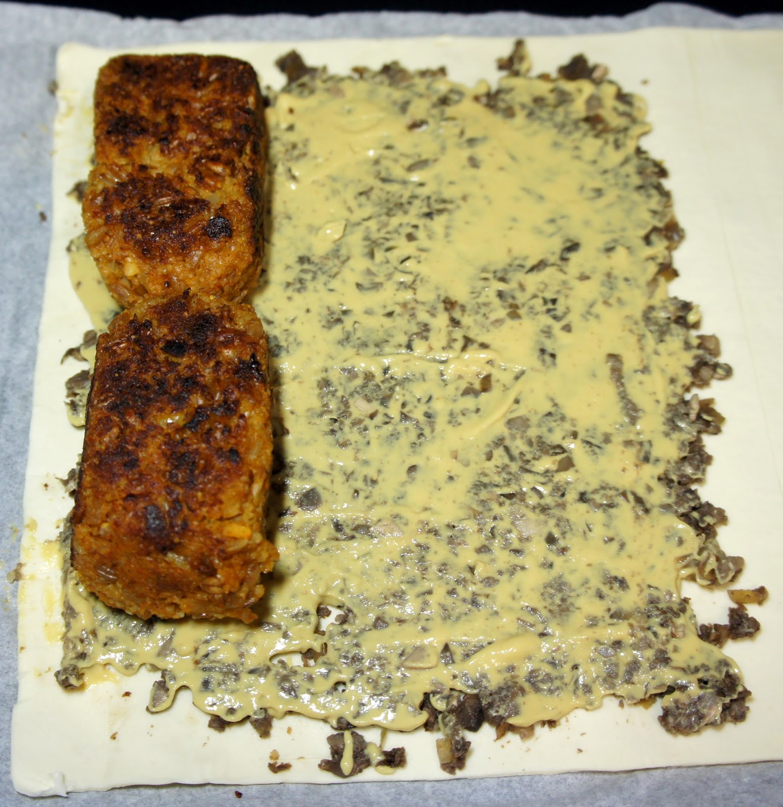 Die Champignonmasse (grob und fein), etwas Salzen und Pfeffern nun in einer Pfanne mit etwas Öl erhitzen, und zwar solange bis kein Wasser mehr aus den Pilzen austritt. Beiseite stellen und abkühlen lassen. Die verbliebene halbe Zwiebel ganz fein Würfeln.Das Toast in feine Würfel schneiden und zum Grünkern geben. Mit Tomatenmark, 1 El Senf, Zwiebelwürfel, Paprikapulver, Nelkenpulver, Piment, Salz und Pfeffer abschmecken.Nun die Grünkernmasse gut kneten, sodass ein formbarer Teig entsteht der zusammenklebt. Sollte es zu feucht sein, etwas Semmelbrösel dazugeben, damit die Feuchtigkeit aufgesaugt werden kann. Den Grünkernteig nun in zwei Teile teilen und formen, eine quaderform eignet sich hierbei am besten.In einer Pfanne Öl erhitzen und die Grünkernquader von allen Seiten gut anbraten. Den Blätterteig von der Rolle wickeln und die Pilzfarce darauf verteilen. Dabei die Ränder etwas aussparen, damit diese als Klebestellen übrig bleiben.