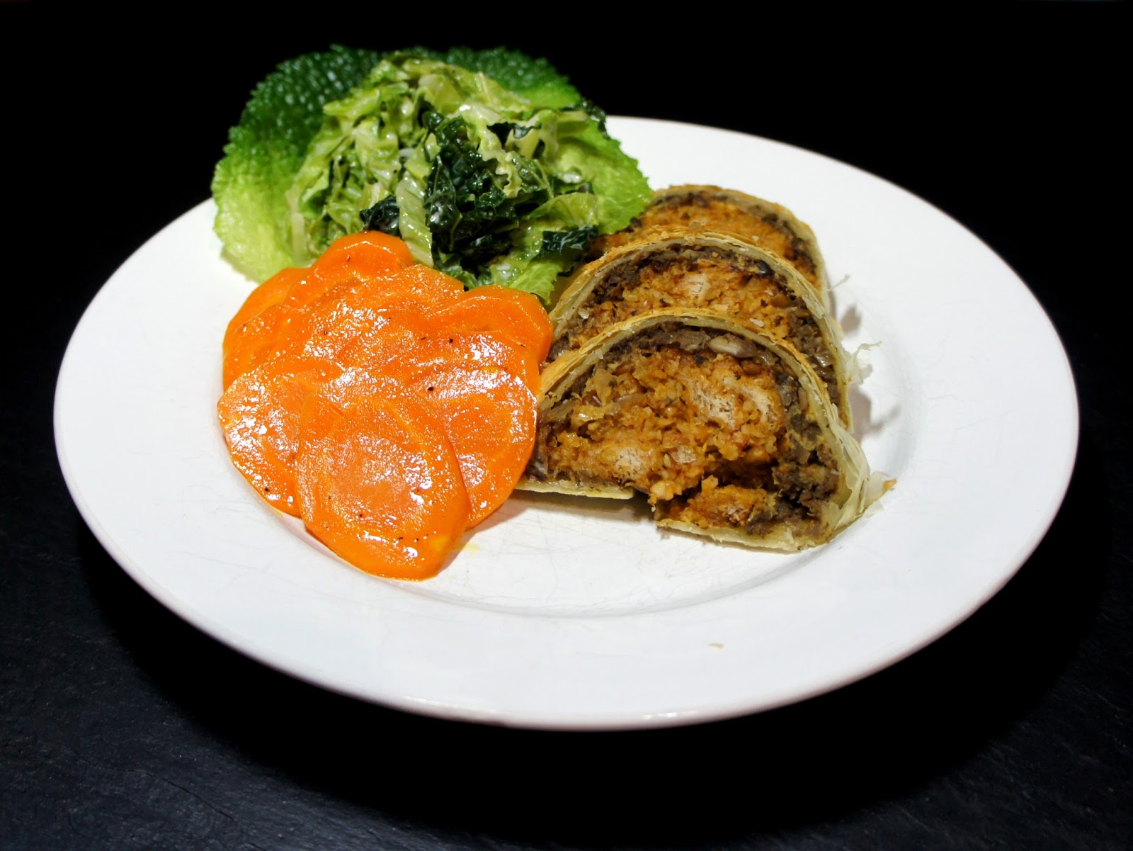 Hauptspeise: Grünkernpastete an glasierten Karotten und Rahmwirsing