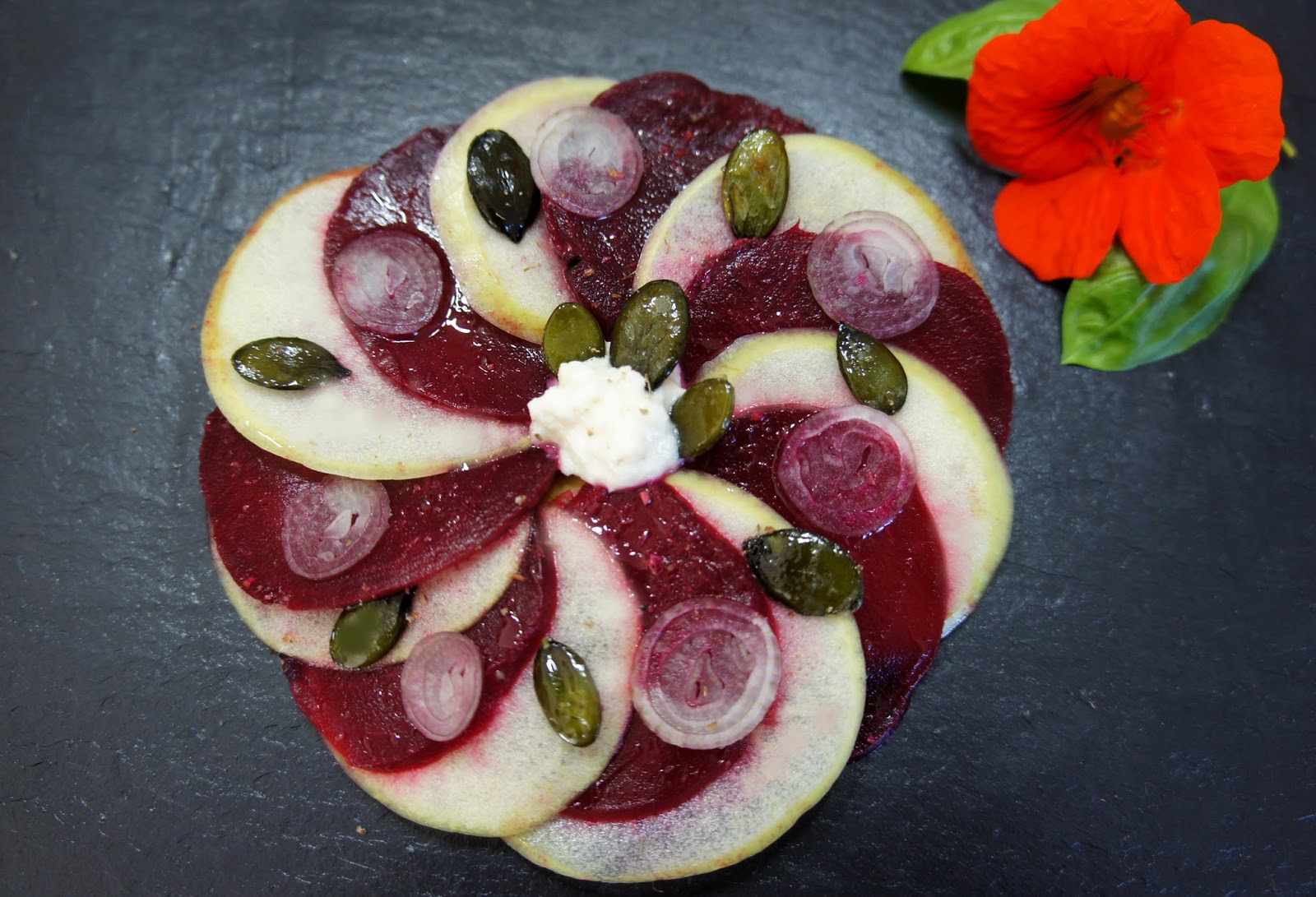 Vorspeise: Rote Bete Apfel Carpaccio mit Meerrettich und karamellisierten Kürbiskernen