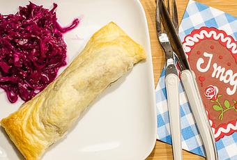 Bavarian sausage Puff Pastry RollsPeel the sausages. Divide the puff pastry into 4 pieces, brush each one with a teaspoon of sweet mustard and add the sausage meat. Fold the puff pastry over it and then bake in the oven at 220 ° C top and bottom heat for about 15 minutes until the puff pastry browns.