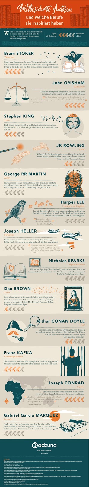 Hätte sich John Grisham überhaupt jemals an die Schreibmaschine gesetzt und geschrieben, wäre er nicht als Anwalt tagelang im Gerichtssaal verweilt? - Ich bezweifle es.Wenn Nicolas Sparks nicht als Arzneimittelvertreter seinen Lebensunterhalt verdient hätte, hätten wir Ryan Gosling jemals in der Verfilmung von Wie ein einziger Tag gesehen? - Naja, vermutlich schon.Eine ganze Liste von einzigartigen Autoren, welche von ihren alltäglichen Jobs zu großen Werken inspiriert wurden – oder eben auch nicht –, seht ihr hier in einer tollen Infografik, welche die Job-Plattform Adzuna freundlicherweise bereitgestellt hat.