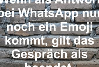 Auf Facebook teilen Vorige Folgende Wenn als Antwort bei WhatsApp nur noch ein... Autor des Artikels : istdaslustig Zum Original-Artikel Wenn als Antwort bei WhatsApp nur noch ein Emoji kommt, gilt das Gespräch als beendet Hier geht es zum Artikel Mehr Lustiges auf www.istdaslustig.de Auf Facebook teilen Vorige Folgende Das könnte Ihnen gefallen Mehr