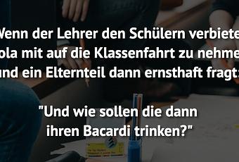 Auf Facebook teilen Vorige Folgende Wenn der Lehrer den Schülern verbietet Cola mit... Autor des Artikels : istdaslustig Zum Original-Artikel Wenn der Lehrer den Schülern verbietet Cola mit auf die Klassenfahrt zu nehmen und ein Elternteil dann ernsthaft fragt: "Und wie sollen die dann ihren Bacardi trinken?" Hier geht es zum Artikel Mehr Lustiges auf www.istdaslustig.de Auf Facebook teilen Vorige Folgende Das könnte Ihnen gefallen Mehr