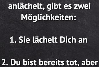 Auf Facebook teilen Vorige Folgende Wenn eine Frau Dich anlächelt, gibt es zwei... Autor des Artikels : istdaslustig Zum Original-Artikel Wenn eine Frau Dich anlächelt, gibt es zwei Möglichkeiten: 1. Sie lächelt Dich an 2. Du bist bereits tot, aber nur sie weiss wie und wann. Hier geht es zum Artikel Mehr Lustiges auf www.istdaslustig.de Auf Facebook teilen Vorige Folgende Das könnte Ihnen gefallen Mehr