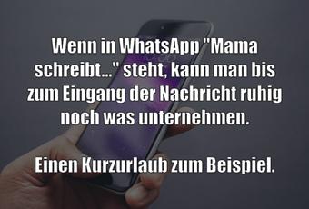 Auf Facebook teilen Vorige Folgende Wenn in WhatsApp "Mama schreibt..." steht, kann... Autor des Artikels : istdaslustig Zum Original-Artikel Wenn in WhatsApp "Mama schreibt..." steht, kann man bis zum Eingang der Nachricht ruhig noch was unternehmen. Einen Kurzurlaub zum Beispiel. Hier geht es zum Artikel Mehr Lustiges auf www.istdaslustig.de Auf Facebook teilen Vorige Folgende Das könnte Ihnen gefallen Mehr