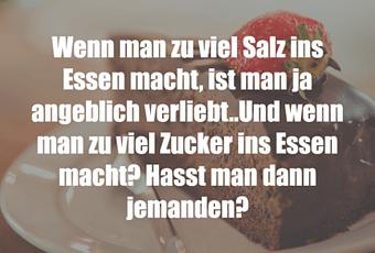 Auf Facebook teilen Vorige Folgende Wenn man zu viel Salz ins Essen macht, ist man... Autor des Artikels : istdaslustig Zum Original-Artikel Wenn man zu viel Salz ins Essen macht, ist man ja angeblich verliebt..Und wenn man zu viel Zucker ins Essen macht? Hasst man dann jemanden? Hier geht es zum Artikel Mehr Lustiges auf www.istdaslustig.de Auf Facebook teilen Vorige Folgende Das könnte Ihnen gefallen Mehr