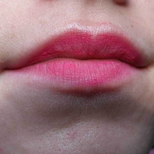 Leider gibt der Lipliner manchmal nur wenig Farbe ab oder manchmal wenn er starke Farbabgabe hat, wird das Ergebnis auf den Lippen fleckig. Zudem bilden sich pinke Krümel auf meinen Lippen, wenn ich sie zusammenpresse. Die matte neonpinke Farbe finde ich persönlich aber toll. Die Konsistenz würde ich mir persönlich cremiger wünschen, da gibt es wesentlich bessere Liplinerkonsistenzen auf dem Markt.Auch die Haftfestigkeit ist nur durchschnittlich, nur zwei bis drei Stunden sehe ich die Farbe und beim Essen und Trinken löst sich viel von der frischen Farbe ab. Auch das Anspitzen des Stiftes funktioniert gut trotz des sehr festen Hartplastikmaterials, das hält mein Kosmetikspitzer aus. Das Herstellerversprechen "Weiche und angenehme Textur" sowie "langanhaltend" wird nach meiner Meinung nach nicht eingehalten.Tragebild starke Farbabgabe mit Krümeln