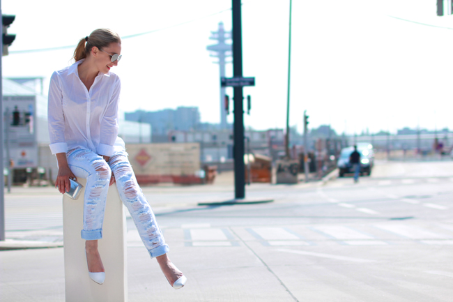 Weiße Bluse, acid washed boyfriend Jeans, weiße Pumps & ein bisschen silber. Eigentlich ganz einfache Zutaten für einen ganz simplen Look. Und dennoch ist das Outfit bereits eines meiner Lieblinge dieser Saison. Der 2. Look meiner "white blouse collection" vermittelt für mich eine große Leichtigkeit, bringt mich zum Strahlen (der grell-weiße Himmel könnte das seinige dazu beigetragen haben) und erinnert mich an Sommer & Meer. Interessanterweise habe ich früher nie acid washed Jeans gemocht - aber in diese Variante habe ich mich dennoch sofort verliebt. Da sieht man mal wieder, dass es Sinn macht, sich außerhalb seiner "Komfortzone" zu bewegen und Neues auszuprobieren. - Oder wie seht ihr das? Hätte ich die Jeans besser im Shop lassen sollen?Shine bright like a diamond.White blouse, acid washed boyfriend jeans, white pumps & a little bit of silver. Actually quite simple ingredients for a quite simple look. Nevertheless this outfit is already one of my favorites this season. Cause this second look of my "white blouse collection" gives me the impression of lightness, it makes me shine bright like a diamond (maybe the bright-blinding sky is also responsible for that) and it reminds me on summer, beach & sea. Interestingly I've never liked or even worn acid washed jeans - but I've immediately felt in love with this model. So once again we can see that it makes sense to leave our comfort zone and try new things. - Don't you agree? Would it have been better to leave this jeans in the shop?jeans - Forever 21 / blouse - Vero Moda / high heels & watch - Buffalo / clutch - C&A / sunglasses - H&M / earrings - vintage