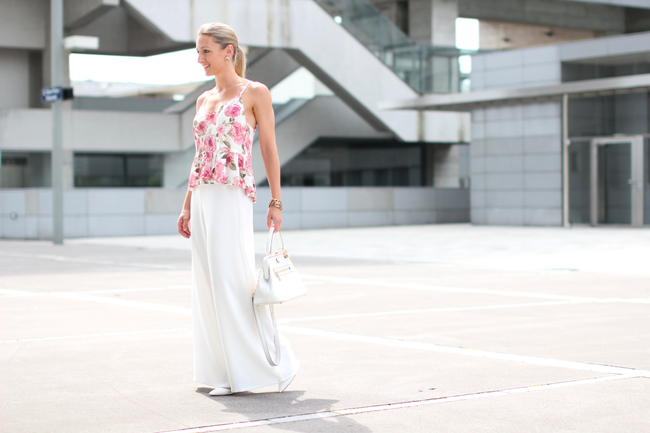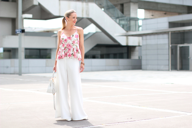 In my case the roses don't grow in the garden or on the terrace, but rather on my summery top. And in my opinion they're looking there quite good :-) ... Cause combined with simple white palazzo pants, white high heels & matching accessories the result is a fresh, but nevertheless chic summer look - quite perfect for a lovely dinner! - What do you think about second outfit of my this week's "flower collection"? And what do you think about floral patterns in general? Thumbs up or down?palazzo pants - Mango / top - Forever 21 / high heels - Zara / bag - Michael Kors / earrings - Majolie