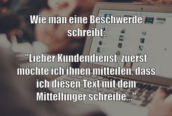Auf Facebook teilen Vorige Folgende Wie man eine Beschwerde schreibt: "Lieber... Autor des Artikels : istdaslustig Zum Original-Artikel Wie man eine Beschwerde schreibt: "Lieber Kundendienst, zuerst möchte ich ihnen mitteilen, dass ich diesen Text mit dem Mittelfinger schreibe..." Hier geht es zum Artikel Mehr Lustiges auf www.istdaslustig.de Auf Facebook teilen Vorige Folgende Das könnte Ihnen gefallen Mehr