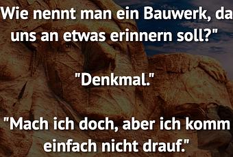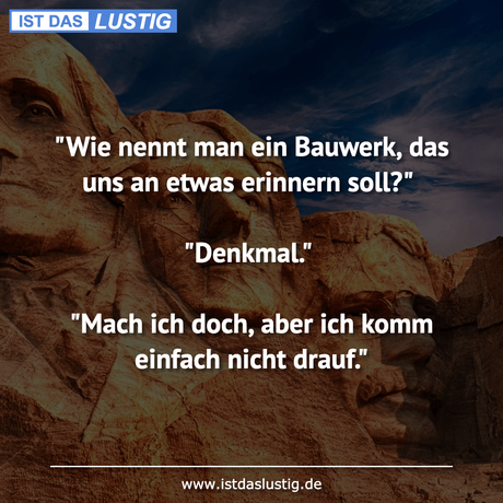 Auf Facebook teilen Vorige Folgende "Wie nennt man ein Bauwerk, das uns an etwas... Autor des Artikels : istdaslustig Zum Original-Artikel "Wie nennt man ein Bauwerk, das uns an etwas erinnern soll?" "Denkmal." "Mach ich doch, aber ich komm einfach nicht drauf." Hier geht es zum Artikel Mehr Lustiges auf www.istdaslustig.de Auf Facebook teilen Vorige Folgende Das könnte Ihnen gefallen Mehr