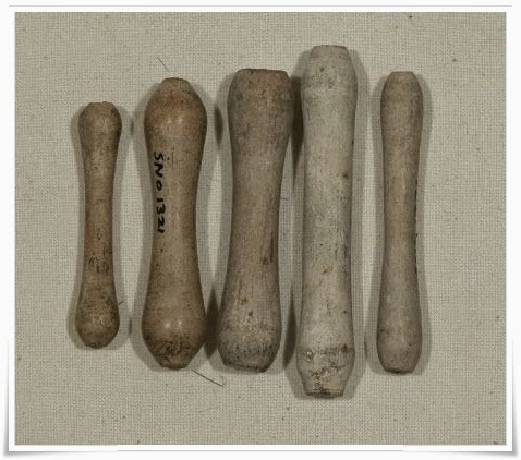 Das Neueste, das dabei entstanden ist, sind diese Wig curlers ("Lockenwickler") aus lufttrocknendem Ton, Frisierhilfen fürs 17te und 18te Jahrhundert, u.a. für die Seitenlocken der Herrenperücken, wie auf der Zeichnung (Abb.2) zu sehen: