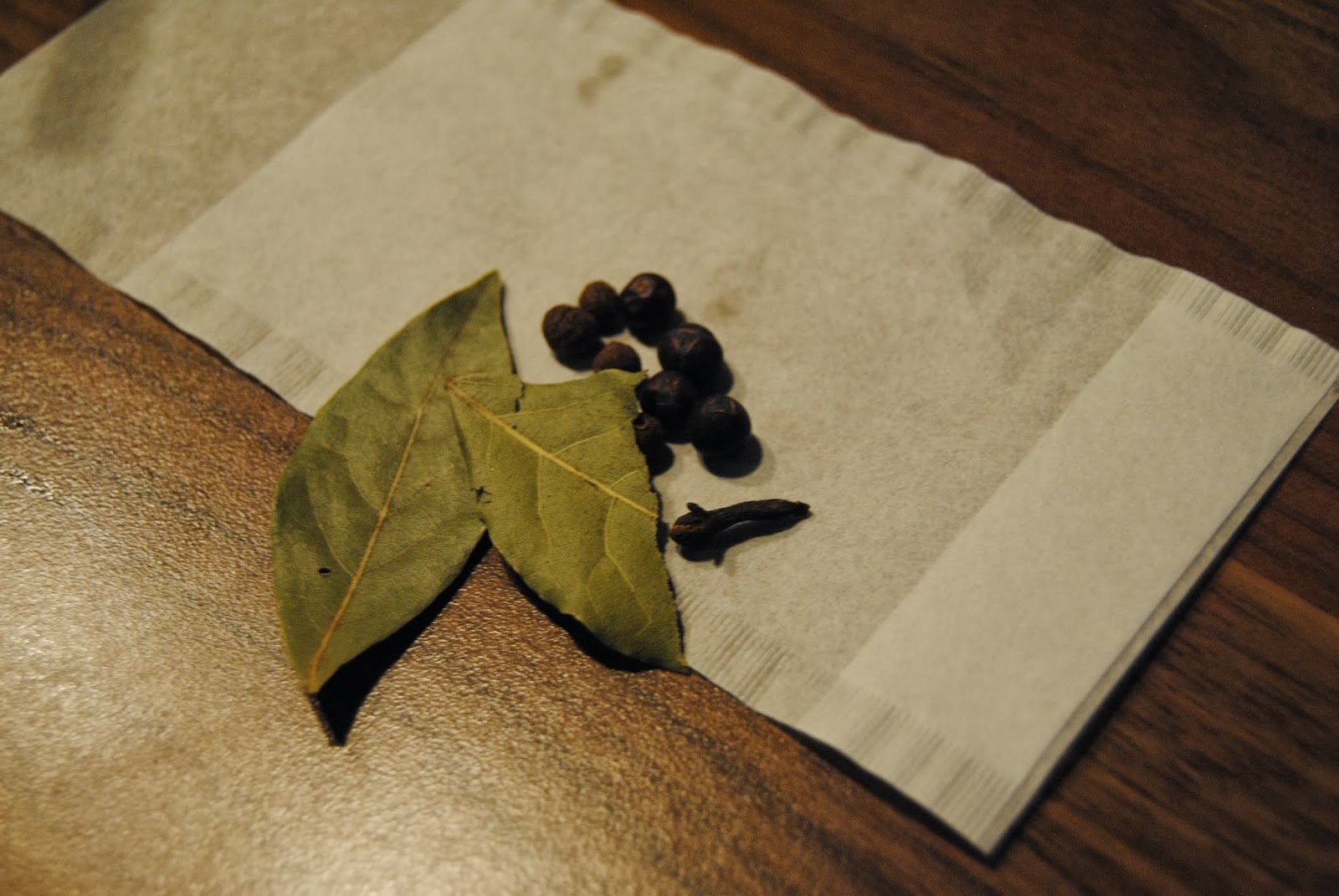 Die Gewürze für das Ragout (Wacholder, Piment, Lorbeer, Nelke) gebe ich in einen Teebeutel und dann ebenfalls in die Pfanne. So muss ich später nicht mühsam alles einzeln aus der Soße fischen.Dann kann man das Ragout erst einmal für die nächsten 30 Minuten abgedeckt sanft köcheln lassen.