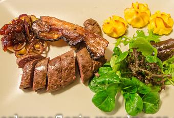 Das Wildhasen-Filet schmeckt leicht nach Leber. Dazu die süß-säuerlichen Äpfel, kräftiger Speck und rote Zwiebeln – eine wunderbare Kombination.