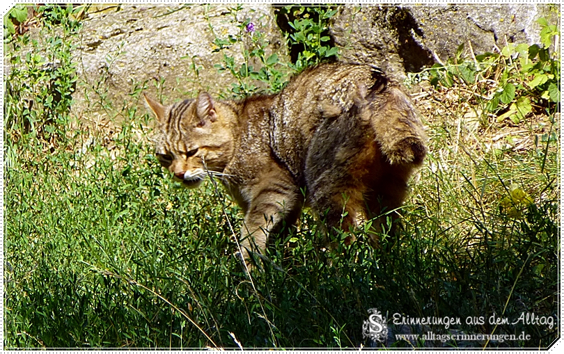 Wildkatze - keine auf zwei Beinen wohl gemerkt.Wildkatzen sind ja sehr selten zu sehen - eigentlich gar nicht und man sollte sienicht mit wilden Hauskatzen verwechseln.Im Unterschied zur Hauskatze, deren Vorfahren sie wohl waren, ist eine von Hand aufgezogene Wildkatze