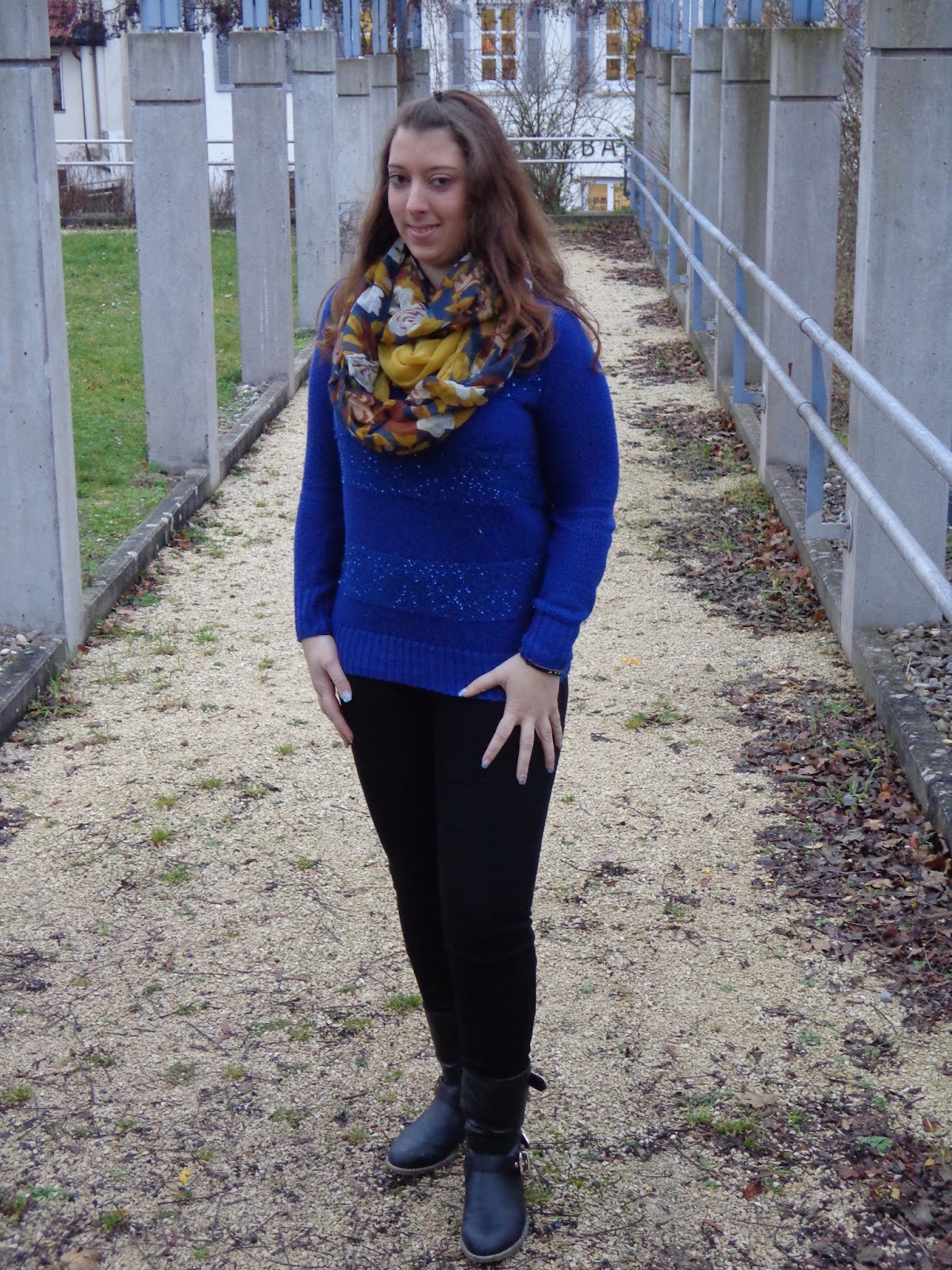 Darunter habe ich einen blauen Pullover angezogen.Diesen habe ich glaub schon 3 Jahre aber ich mag ihn immer noch sehr.Er ist gestreift mit Pailetten und ich find ihn wunderschön.